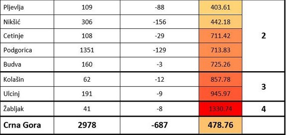 Na osnovu svih registrovanih slučajeva obolijevanja u periodu od subote 10. oktobra u 00:00h do i zaključno sa petkom 23. oktobrom 2020. u 24:00 h, izračunate su vrijednosti 14-dnevnih opštinskih stopa kumulativne incidencije za navedeni period i sačinjena lista opština u kojima će se sa primjenom mjera započeti po automatizmu od ponedjeljka 26. oktobra u 00:00 sati, saopšteno je iz Instituta za javno zdravlje.