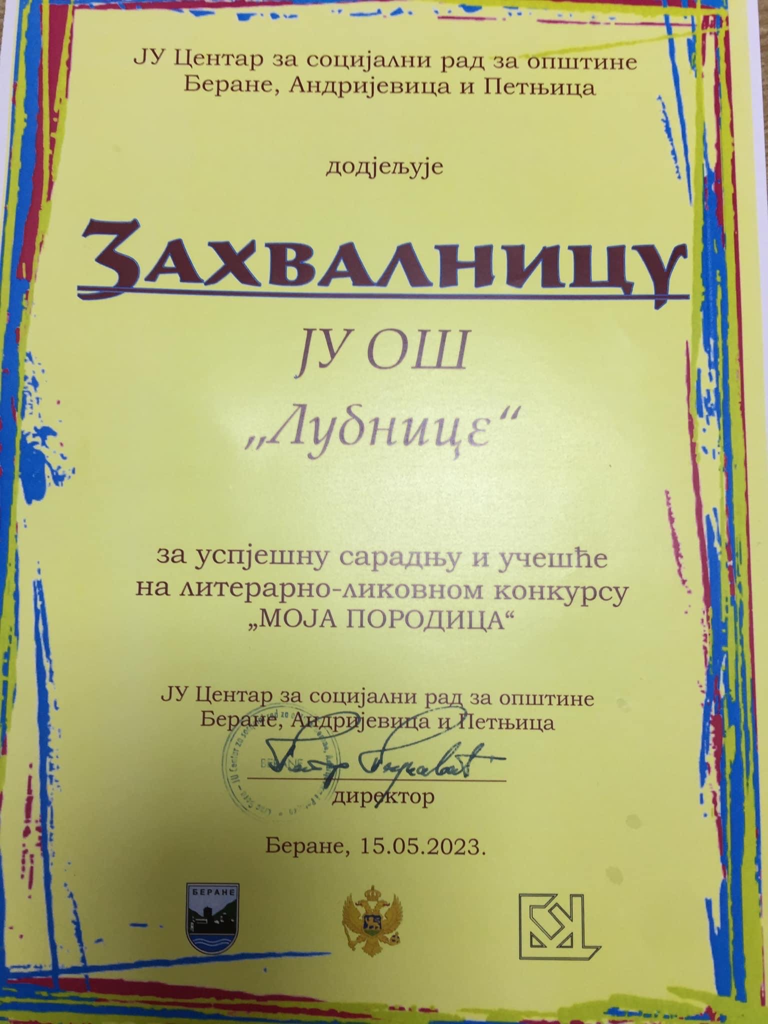 Učenici naše škole su učestvovali na konkursu a škola je dobila zahvalnicu za učešće. “Ova manifestacija se prvi put održava ove godine i nadam se da će postati tradicija”, rekao je između ostalog direktor Centra za socijalni rad, Petar Pajković.