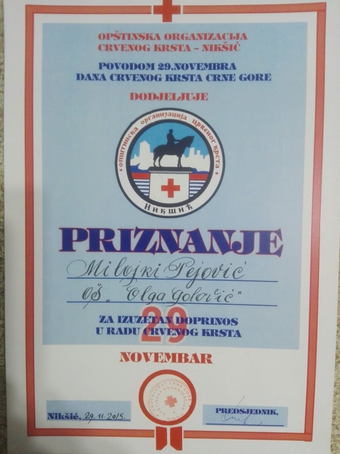 “Zbog dugogodišnje saradnje sa izuzetnim HUMANISTIMA koji rade i djeluju godinama pružajući pomoć svima koji su u nevolji i nemaštini. Čak i u danima, izuzetno teškim za vrijeme KORONE djelovali su volonteri na najbolji način. Nijesu izostali obilasci najudaljenijih mjesta gdje je pomoć bila potrebna. Godinama, generacije koje rade pod mojim nadzorom učim šta ta riječ znači -HUMANOST. Hvala Ani, Midu, Goranu kohi širom otvaraju vrata Crvenog Krsta. Hvala, nedavno preminulom Vitomiru-Vitu Lekić koji je bio veliki HUMANISTA koji je takođe dao svoj veliki doprinos u dugogodišnjim aktivnostima Crvenog krsta”, kazala nam je Milojka Mica Pejović, likovni pedagog škole.