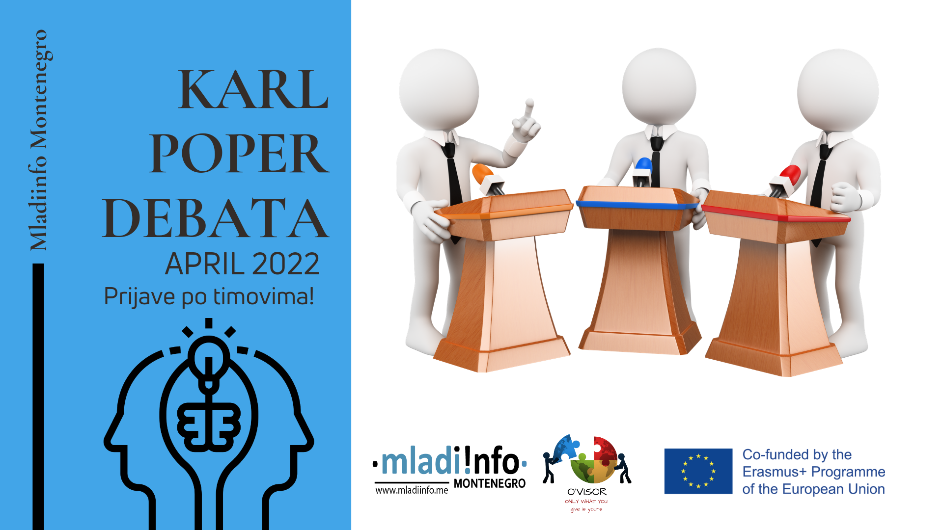 NVO Mladiinfo Montenegro (m!M) organizuje konkurs za Karl Poper debatu u okviru projekta O’visor. Ovim putem vas pozivamo da se prijavite za učešće na Nacionalnom takmičenju u Karl Poper debati, koje će biti održano u toku aprila.
