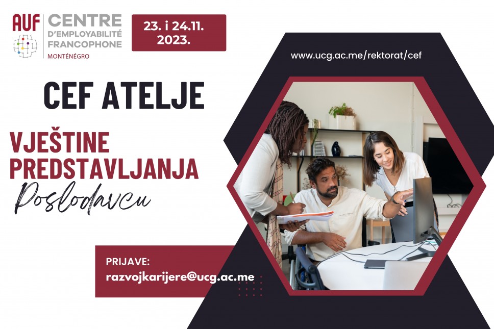 U organizaciji Frankofone kancelarije za zapošljavanje i Kancelarije za razvoj karijere i cjeloživotno učenje Univerziteta Crne Gore održaće se dvodnevna radionica pod nazivom “CEF atelje – Vještine predstavljanja poslodavcu”, namijenjena studentima svih godina studija.