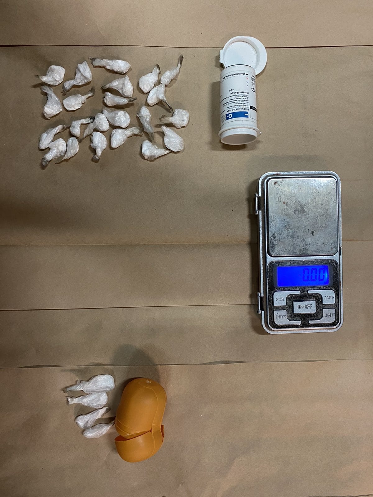 Prilikom pretresa policija je pronašla i oduzela 26 manjih pvc pakovanja sa sadržajem bijele praškaste materije za koju se sumnja da je opojna droga kokain, zatim vagu za precizno mjerenje, kao i dva mobilna telefona.