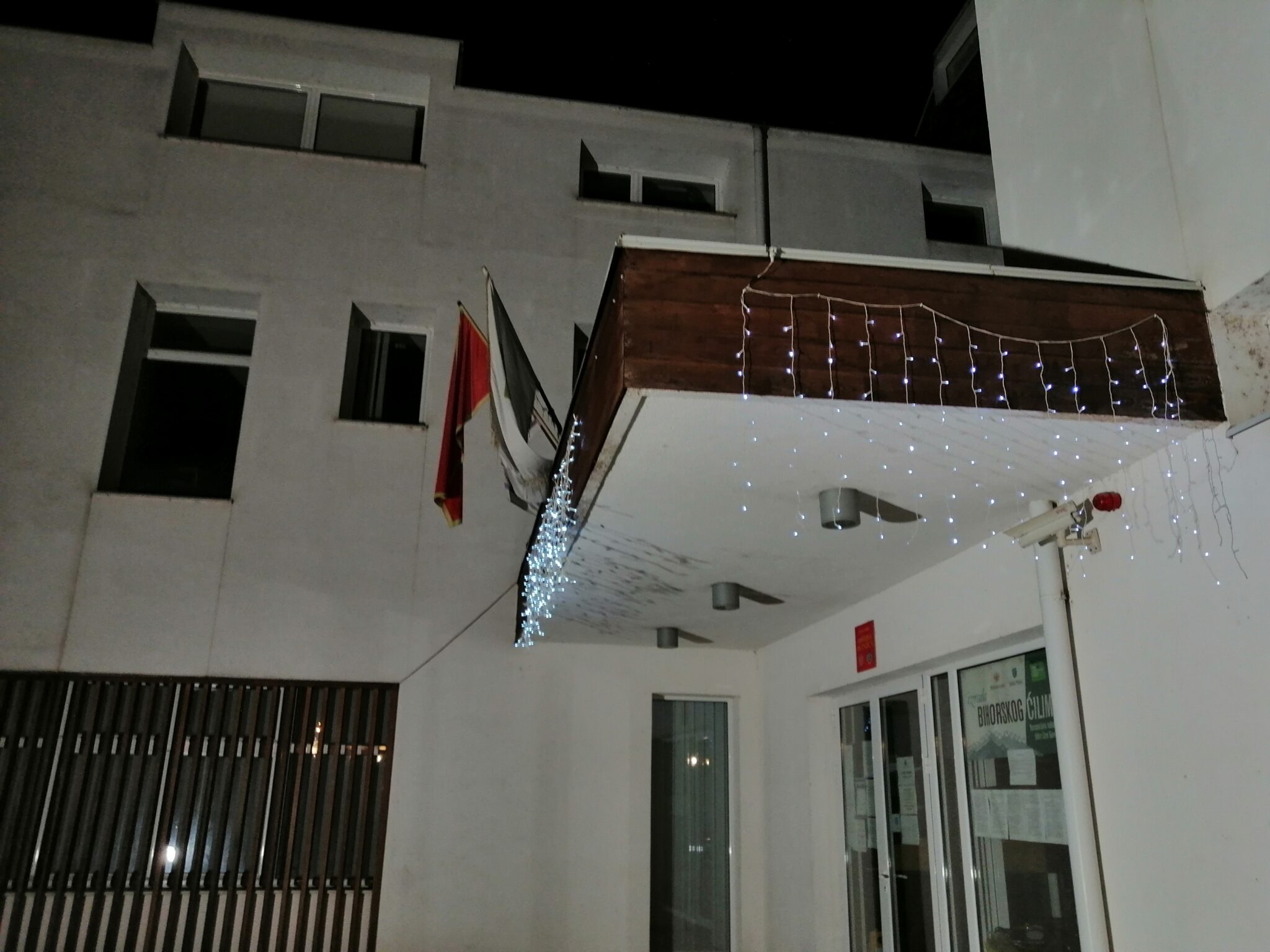 Radnici Komunalog preduzeća zgradu Opštine okitili su novogodišnjim svetiljkama, pa će centar Petnjice osvanuti uz male svetlucave lampice na samom prilazu.