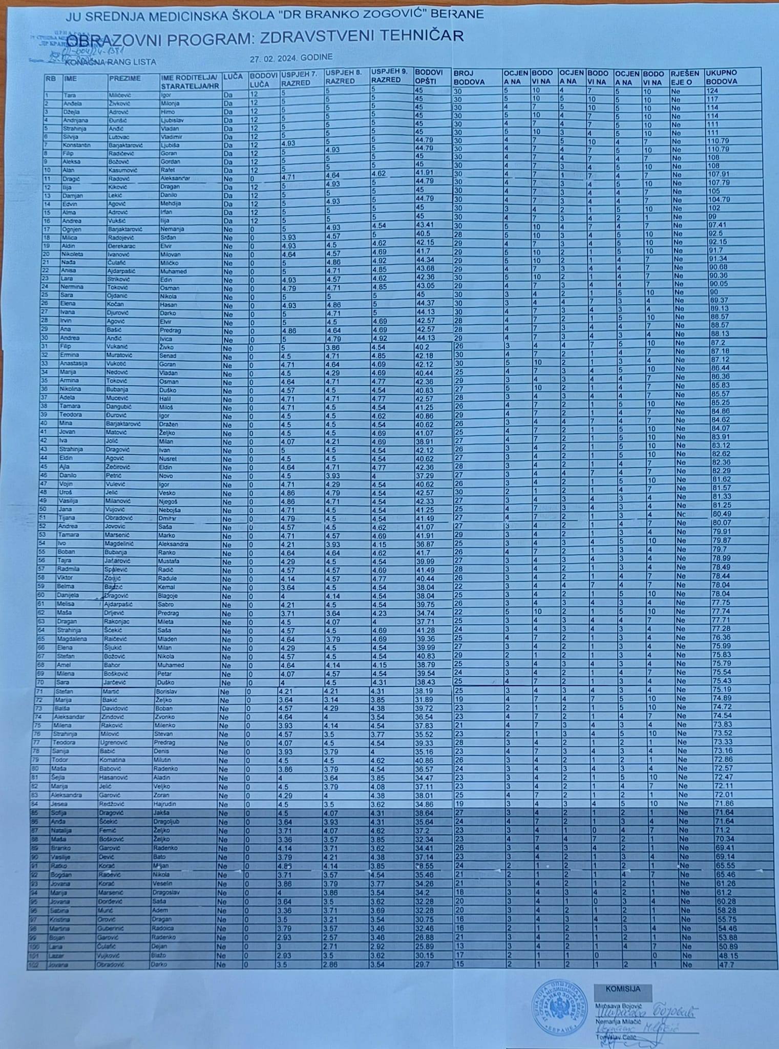 Konačne rang liste za prvi razred mogu se pronaći na fejsbuk stranici Srednje medicinske škole Berane.