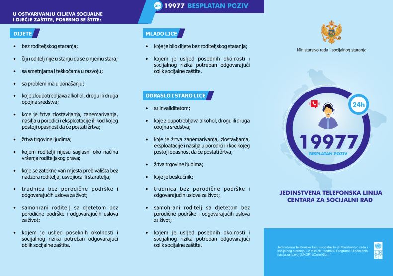 Kako si naglasili, jedinstvena telefonska linija centara za socijalni rad namijenjena je građanima da, ukoliko su u saznanju da je određenom licu usljed posebnih okolnosti i socijalnog rizika potreban odgovarajući oblik socijalne zaštite, mogu besplatno da prijave nadležnom centru.