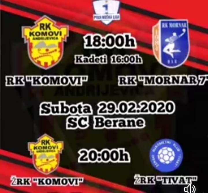 Nešto ranije odigraće se uvodni meč između kadeta RK “Komovi“ i RK “Mornar 7“ sa početkom u 16 časova.
