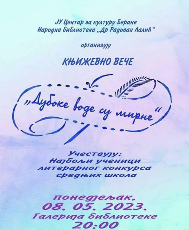 U organizaciji Centra za kulturu i Narodne biblioteke “Dr Radovan Lalić”, večeras, 8. maja, u 20 časova, biće održano književno veče pod nazivom „Duboke vode su mirne“.