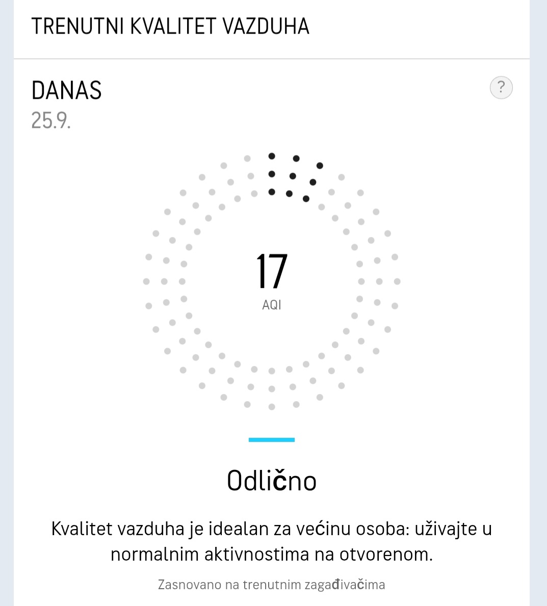 Kvalitet vazduha je idealan za većinu osoba: uživajte u normalnim aktivnostima na otvorenom.