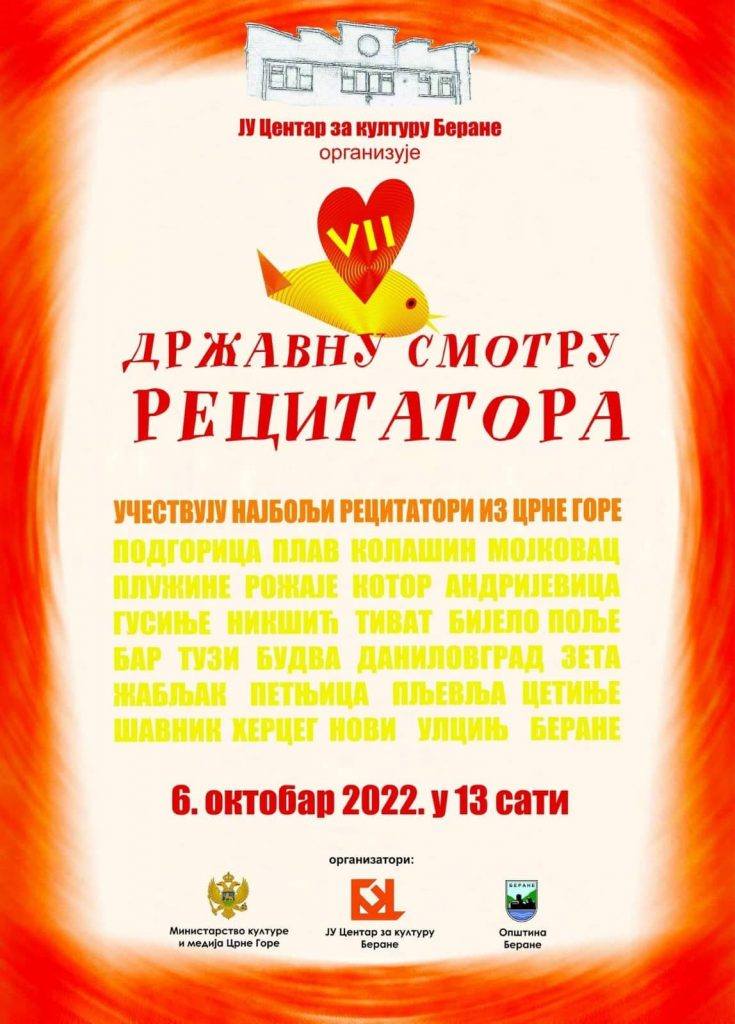 JU Centar za kulturu Berane, u saradnji sa Opštinom Berane, organizuje VII Državnu smotru recitatora Crne Gore u četvrtak, 06. oktobra 2022. godine.