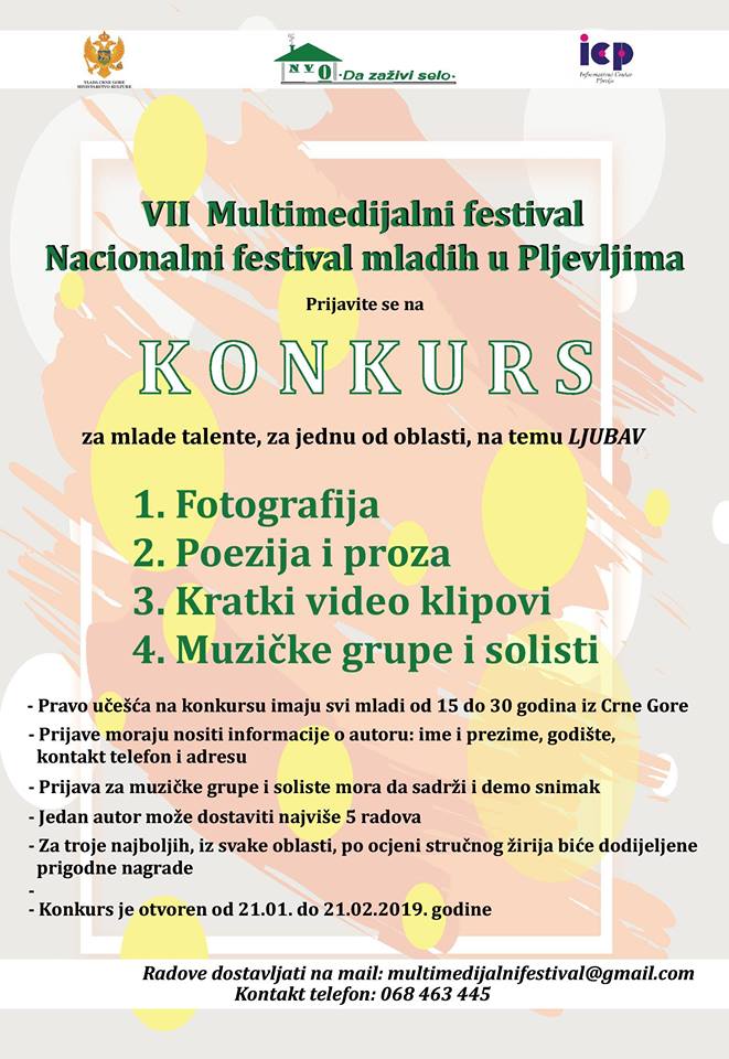 U okviru VII Multimedijalnog festivala – Nacionalnog festivala mladih u Pljevljima, raspisan je konkurs za mlade talente, za jednu od oblasti, na temu “ljubav”. Ove godine oblasti su fotografija, poezija i proza, kratki video klipovi i muzičke grupe i solisti.