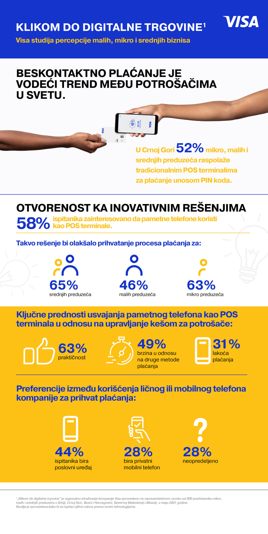 Istraživanje „Klikom do digitalne trgovine“ je regionalna studija percepcije mikro, malih i srednjih preduzeća koju je kompanija Visa sprovela u Srbiji, Crnoj Gori, Severnoj Makedoniji, Bosni i Hercegovini i Albaniji. Zanimljivo je da razmišljanje da će Tap to Phone tehnologija olakšati proces plaćanja raste kako raste i veličina preduzeća, dok u Crnoj Gori prednost upotrebe mobilnog telefona kao POS terminala prepoznaju gotovo u jednakoj mjeri vlasnici srednjih i mikro preduzeća.