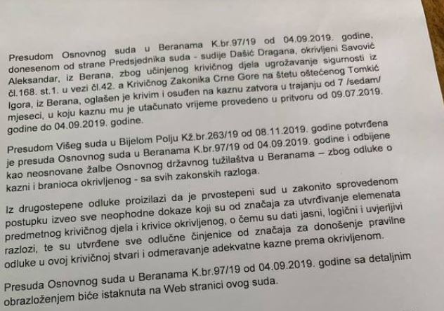 U nastavku detaljno pročitajte šta piše u saopštenju beranskog Osnovnog suda koje je dostavljeno Anteni M.