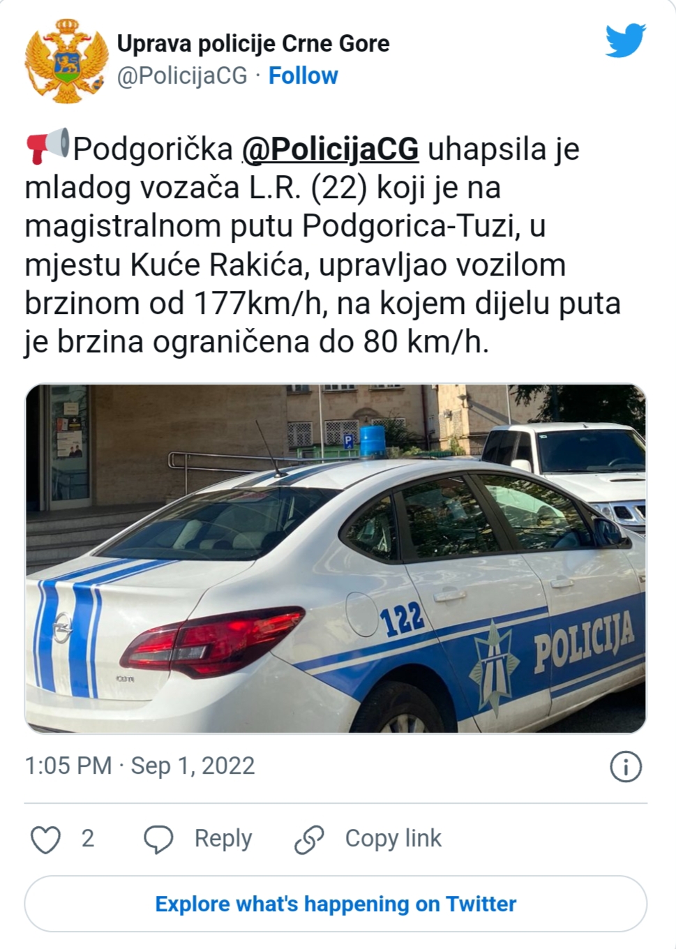 Podgorička policija uhapsila je mladog vozača L. R. (22) koji je na magistralnom putu Podgorica-Tuzi, u mjestu Kuće Rakića, upravljao vozilom brzinom od 177km/h, na kojem dijelu puta je brzina ograničena do 80 km/h, saopšteno je iz Uprave policije. Post navigation Bez poskupljenja struje, stručnjaci preporučuju mjere štednje Anketa: Sea dance oduševio fanove