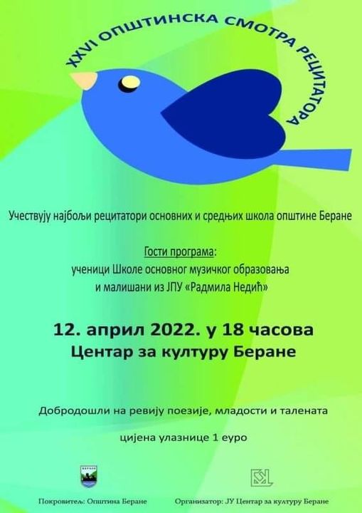 U sali centra za kulturu 12 aprila od 18h održaće se tradicionalna XXVI opštinska smotra recitatora. Učestvuju najbolji recitatori osnovnih i srednjih škola opštine Berane.
