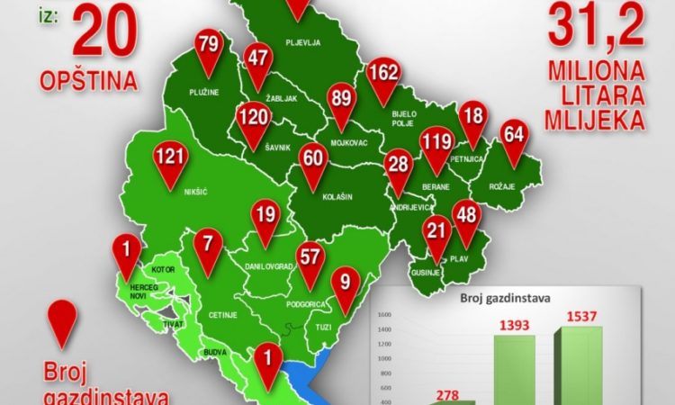 “Za premiju u ovoj godini prijavilo se ukupno 1,54 hiljade poljoprivrednih gazdinstava. Ona su prijavila proizvodnju od 31,2 miliona litara mlijeka, od kojeg je proizvedeno 3,73 hiljade tona sira i 12 tona kajmaka”, navodi se u saopštenju.
