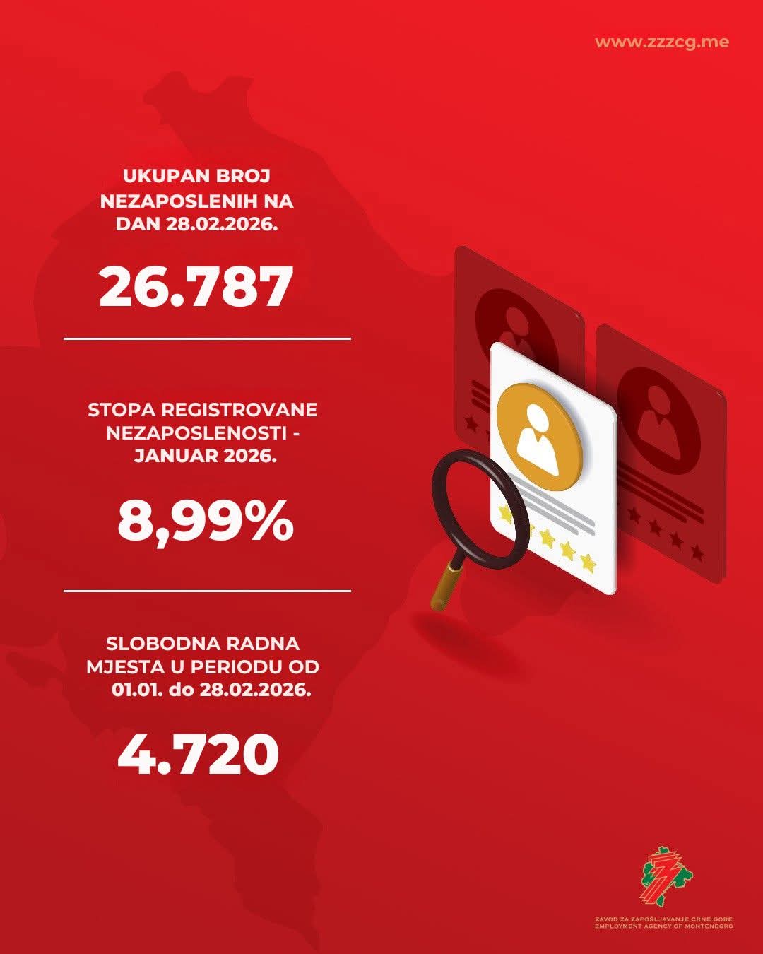 Na evidenciji Zavoda za zapošljavanje Crne Gore, zaključno sa 28. februarom 2026. godine, nalazi se 26.787 nezaposlenih lica.
