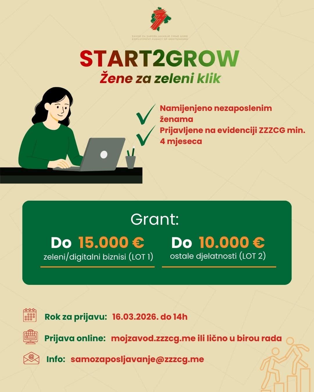 Zavod za zapošljavanje Crne Gore objavio je javni poziv u okviru programa “START2GROW – žene za zeleni klik”, koji ima za cilj podršku samozapošljavanju nezaposlenih žena kroz dodjelu bespovratnih sredstava za pokretanje biznisa.